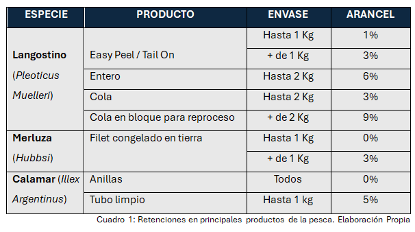 Actualmente, la Pesca abona aranceles que van del 1% al 9%, dependiendo la especie y el grado de valor agregado. Si tenemos en cuenta las principales pesquerías (merluza hubbsi, calamar illex y langostino) obtenemos el siguiente resumen: