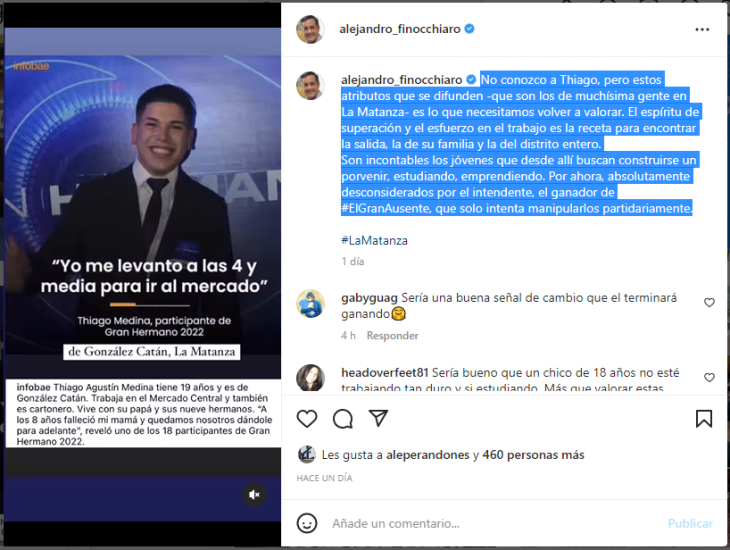 En ese marco, el diputado nacional del PRO Alejandro Finocchiaro se metió en la rosca “granhermanesca” y opinó sobre las necesidades de Thiago Medina y sus vivencias en el distrito de La Matanza.