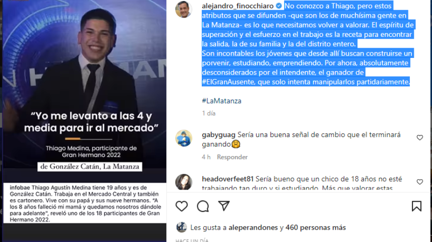 La intención de Finocchiaro es clara. La búsqueda final son los votos para el año que viene. Y se observa que es el propio dirigente del PRO quien afirma no conocer al participante del reality, por lo que demuestra que se guía por lo que muestra la televisión sin chequear que lo dicho por Thiago sea cierto.