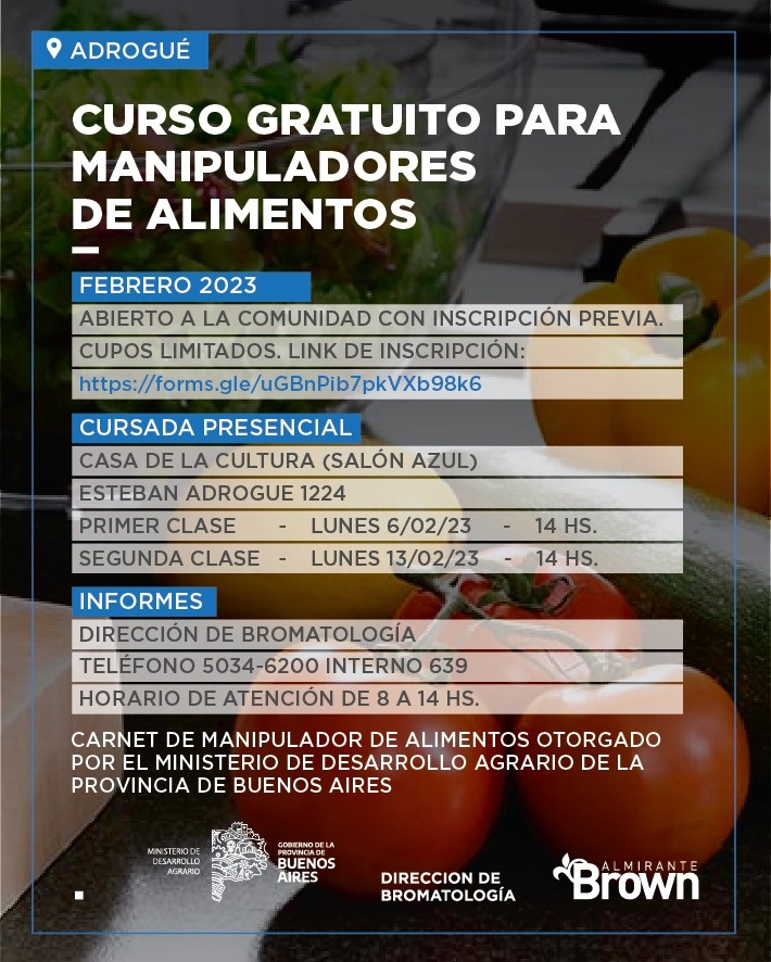 El Municipio de Almirante Brown informó que está abierta la inscripción del nuevo curso oficial de “Manipulación Segura de Alimentos”, de modalidad presencial, promovido a través de la Dirección de Bromatología de la Comuna browniana.