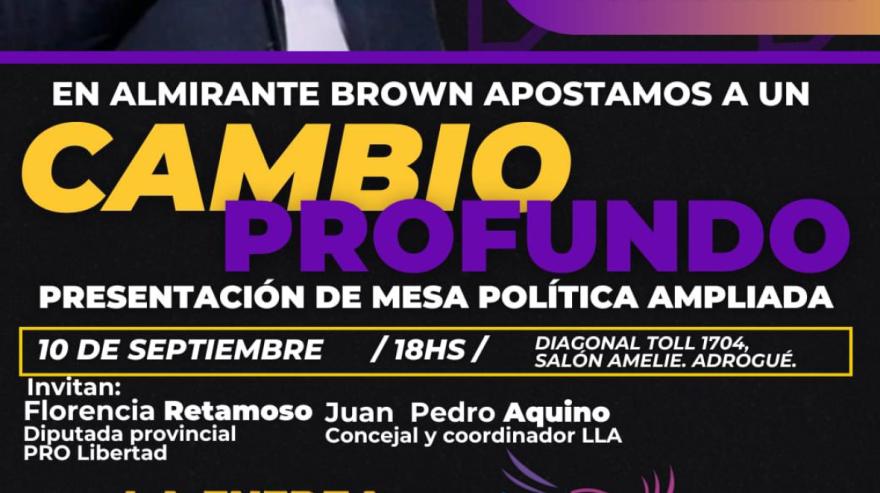El próximo 10 de septiembre en el Salon Amellie de Adrogue, partido de Almirante Brown La Libertad Avanza y el PRO Libertad llevarán adelante una mesa poítica bajo el lema “Un cambio profundo”.