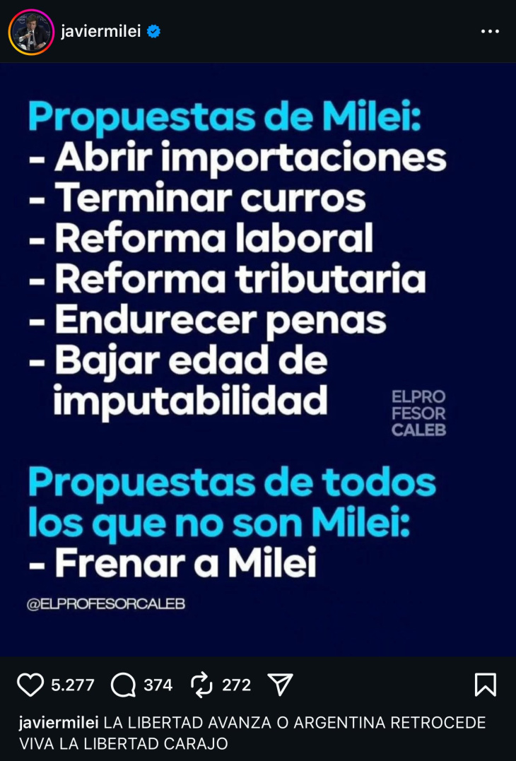 El presidente Javier Milei, en plena campaña y esquivando las esquirlas de los supuestos casos de corrupción que lo persiguen, como el de Libra y el de su hermana Karina, más el presunto nexo entre José Luis Epsert y el narcotráfico que habría solventado su campaña electoral del 2019, cazó el celular y lanzó una betería de propuestas en un posteo en redes sociales.
