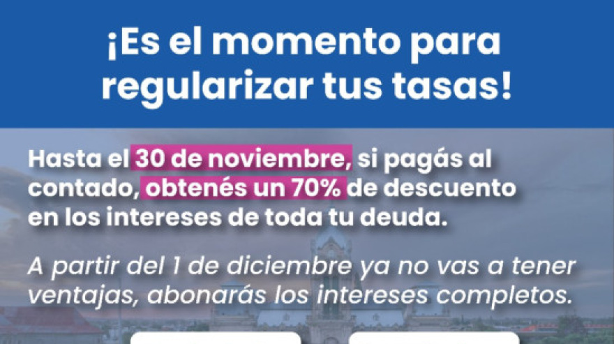 El Municipio de Tres Arroyos informa que, hasta el 30 de noviembre, los contribuyentes podrán regularizar sus deudas con un 70% de descuento en los intereses adeudados.