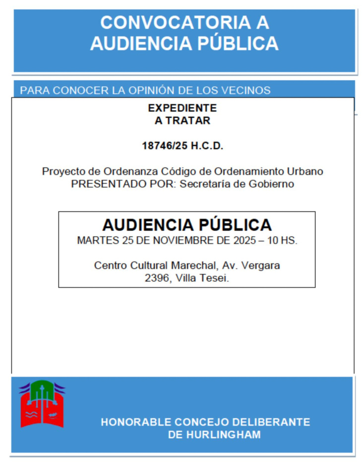 La cantidad de vecinos que se anotaron para asistir a la audiencia pública por el Nuevo Código de Ordenamiento Urbano supera ampliamente la capacidad del HCD. Por lo tanto, para favorecer una mayor participación de la ciudadanía, la audiencia citada para el día Martes 25/11/25 a las 10hs tendrá lugar en el Centro Cultural Leopoldo Marechal, sito en Avenida Vergara 2396, Villa Tesei.