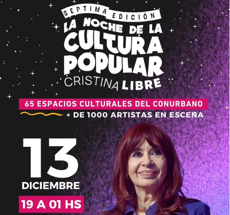 El 13 de diciembre de 19 a 01 hs se celebra la 7ma Edición de La Noche de la Cultura Popular bajo la consigna “Cristina Libre”. Un evento que reúne a más de 60 espacios culturales autogestivos y más de 1000 artistas en escena. Con entrada libre y gratuita, se llevará a cabo en instituciones barriales y plazas de los municipios de Avellaneda, A. Brown, Quilmes, Lanús, Lomas de Zamora, La Matanza, Ensenada, Fcio. Varela, Berazategui, San Vicente, Pte. Perón, Ezeiza y Sur de CABA.