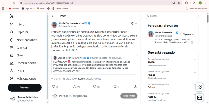 Por las redes sociales, Arietto en un primer momento que “habrían denunciado a un altísimo funcionario del Banco Provincia por acoso sexual y violencia de género y el kirchnerismo está buscándole un salvoconducto dándole la jubilación”. Y se preguntó: “¿No fallan los kukas defendiendo violines eh?”.