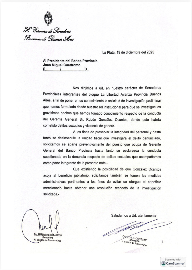 A Juan Cuattromo, presidente del Banco Provincia, Arietto y sus compañeros de espacio legislativo, también le enviaron una carta señalando que “alos fines de preservar la integridad del personal y hasta tanto se desinsacule la unidad fiscal que investigara el delito denunciado, solicitamos se aparte preventivamente del puesto que ocupa de Gerente General del Banco Provincia hasta tanto se esclarezca la conducta cuestionada en la denuncia respecto de delitos sexuales que acompañamos como parte integrante de la presente nota”.