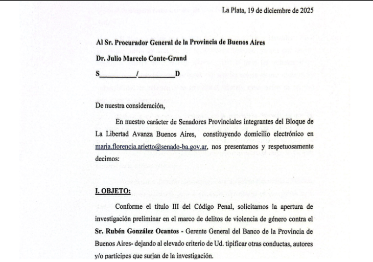 La legisladora, con el acompañamiento de sus pares de bloque, envió una misiva hace unas semanas al Procurador General de la Provincia de Buenos Aires, doctor Julio Marcelo Conte-Grand, que “conforme el título III del Código Penal, solicitamos la apertura de investigación preliminar en el marco de delitos de violencia de género contra el Sr. Rubén González Ocantos - Gerente General del Banco de la Provincia de Buenos Aires- dejando al elevado criterio de Ud. tipificar otras conductas, autores y/o partícipes que surjan de la investigación”.