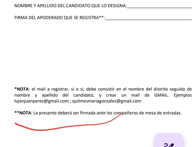 En la denuncia, varios apoderados sostienen que ayer tuvieron que llevar las fichas a Uruguay 580 con firma certificada por escribano o juez de paz más un poder del candidato a presidente. Claro, históricamente, se presentaban los apoderados con la lista, avales y listo.