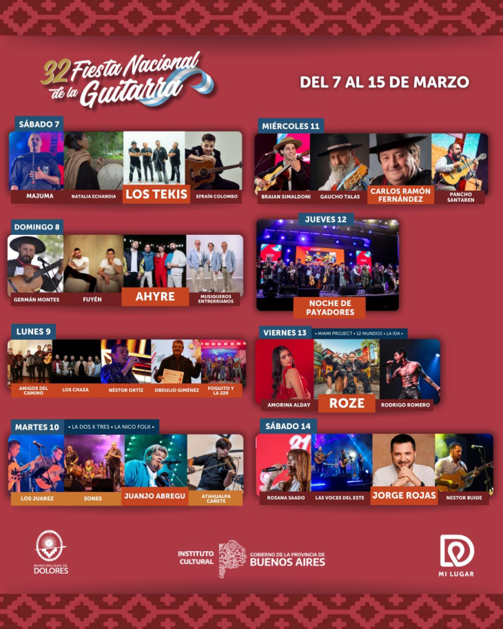 La Fiesta Nacional de la Guitarra anunció su programación 2026, que se desarrollará del 7 al 14 de marzo, con una grilla diversa y de alto nivel artístico que reúne a figuras consagradas del folclore y a artistas de fuerte proyección nacional.