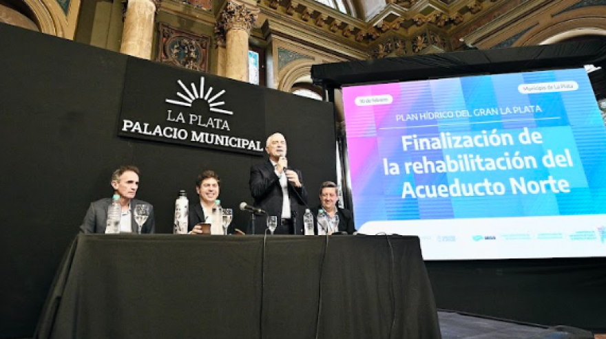 El gobernador de la provincia de Buenos Aires, Axel Kicillof, encabezó este martes el acto de habilitación del Acueducto Norte de la ciudad de La Plata, una obra que demandó una inversión de $10.213 millones para mejorar el abastecimiento de agua potable en la capital bonaerense. Fue en el Salón Dorado de la Municipalidad, junto al intendente local, Julio Alak; el ministro de Infraestructura y Servicios Públicos, Gabriel Katopodis, y el subsecretario de Recursos Hídricos, Néstor Álvarez.
