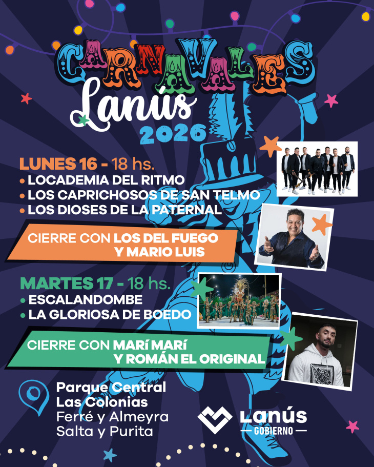Lanús Gobierno invita a los vecinos y a las vecinas a presenciar los diversos espectáculos musicales que se realizarán por los Carnavales Lanús 2026 este lunes 16 y el martes 17 de febrero en el Parque Central Las Colonias, ubicado en Salta y Purita en Remedios de Escalada. Allí se presentarán varios artistas y elencos como Los Del Fuego, Mario Luis, Marí Marí y Román El Original, entre otros.