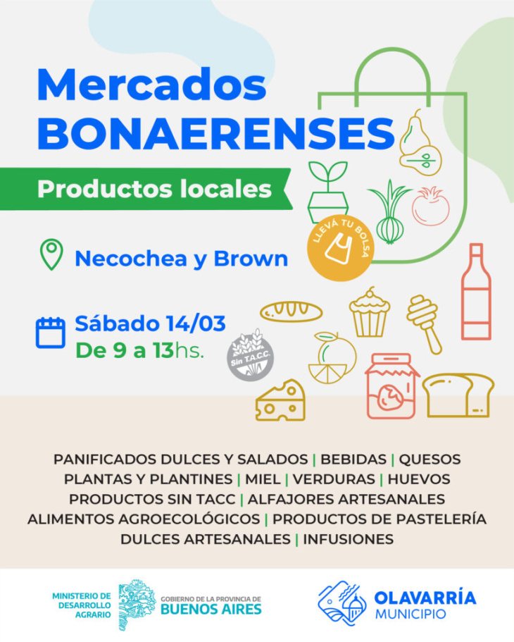 El Municipio de Olavarría recuerda que el próximo sábado 14 de marzo se llevará a cabo una nueva edición del programa “Mercados Bonaerenses”, en Parque Mitre, Necochea y Brown.
