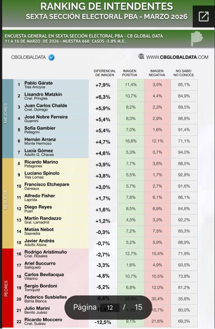 En el otro extremo del ranking se ubican los intendentes con peor diferencial de imagen en la sección. En último lugar aparece Ricardo Moccero (Coronel Suárez), con un diferencial de -12,5 puntos porcentuales; seguido por Julio Marini (Benito Juárez), con -11,4 puntos; y Federico Susbielles (Bahía Blanca), con -6,6 puntos.